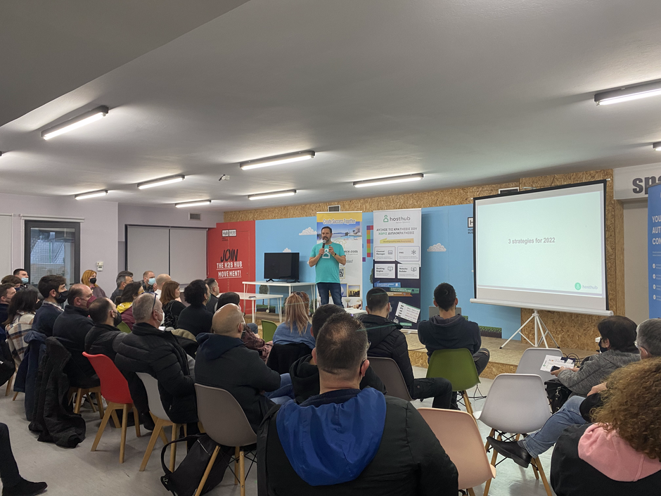 Επιπλέον, παρουσιάστηκε συνοπτικά η πλατφόρμα της Hosthub που βοηθά οικοδεσπότες να διαχειριστούν κρατήσεις από πολλαπλά κανάλια, να αποφεύγουν τις διπλοκρατήσεις και να γλυτώσουν πολύτιμο χρόνο και χρήμα μετατρέποντας χειροκίνητες εργασίες (όπως η καταχώριση κρατήσεων στο μητρώο της ΑΑΔΕ) σε αυτόματες.
